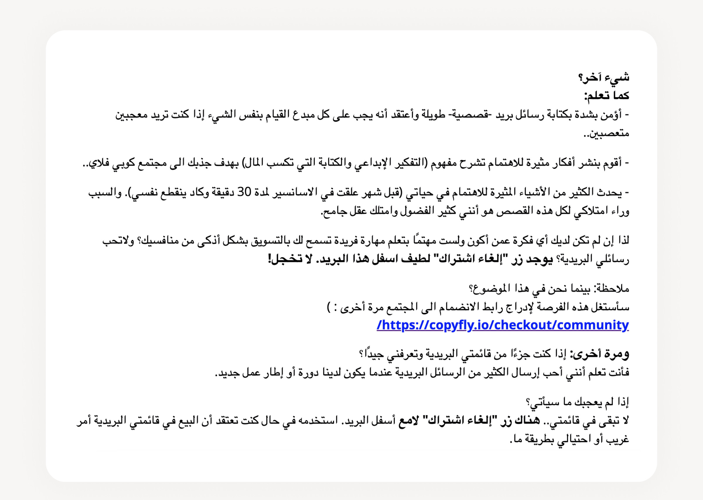 وقد عرضتها على كل مشتركين قائمتي (كوبي فلاي) مع تحدي: أن يقضوا 3 أسابيع بتلقي الرسائل وأخذ حياتهم على محمل الجد دون شكوى..